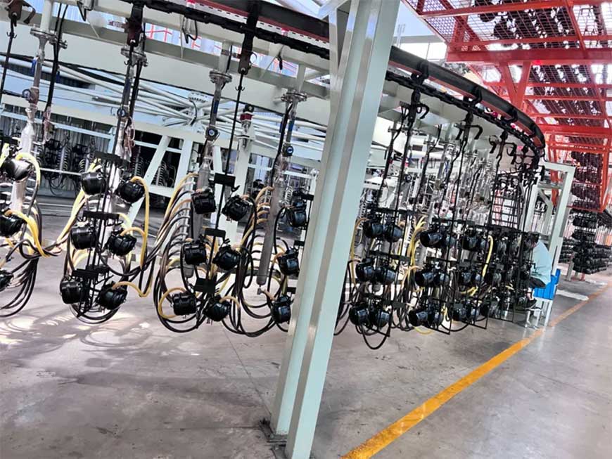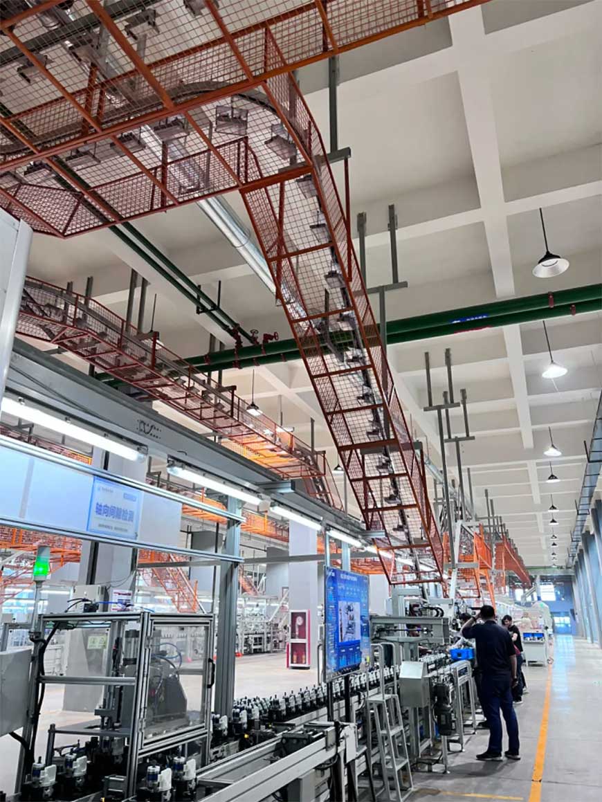 除了生產(chǎn)設(shè)備之外,整個(gè)工廠的規(guī)劃,生產(chǎn)線的流程設(shè)計(jì),都是按照頂級(jí)智能制造工廠的規(guī)格設(shè)計(jì)。在生產(chǎn)車間內(nèi),經(jīng)常會(huì)看到正在生產(chǎn)過(guò)程中的壓縮機(jī)在電梯前“等待進(jìn)電梯”從而進(jìn)入下一道工序。而空中的產(chǎn)品運(yùn)輸帶也隨處可見。